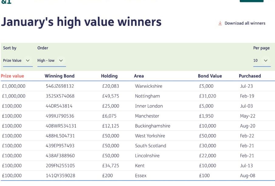 NS&I’s published list of recent big prize winners (between £5,000 and £1 million) includes a £100,000 bond in Surrey (bond 612KM324421, Jan-25) and several £5,000 winners: bond 632RE480900 in Lincolnshire (Jul-25); bond 84HE335996 in Essex (Nov-00); bond 228ME129557 in Hertfordshire (Aug-14); and bond 206AM939741 in Shropshire (May-13). Earlier in the year, a Suffolk holder won a £1 million prize on a bond numbered 570QM451332.