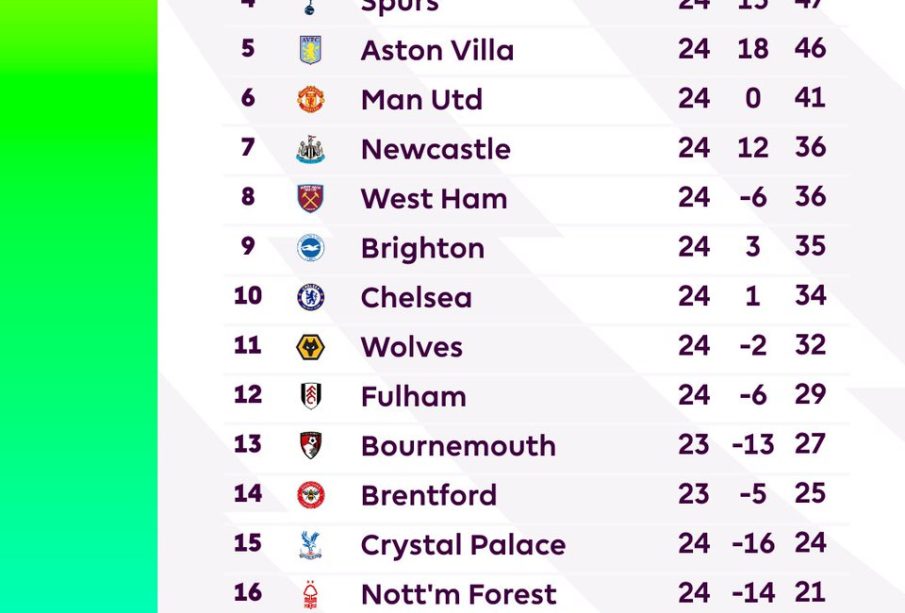 Sky Sports shows Newcastle United in 12th with 39 points from 29 games (11 wins, 6 draws, 12 losses; 42 GF, 43 GA), while Brighton and Hove Albion appear 14th with 37 points (29 matches; 9 wins, 10 draws, 10 losses; 38 GF, 36 GA). These mid‑table positions reflect a congested area where a small streak of results can move clubs quickly toward European contention or deeper into danger.