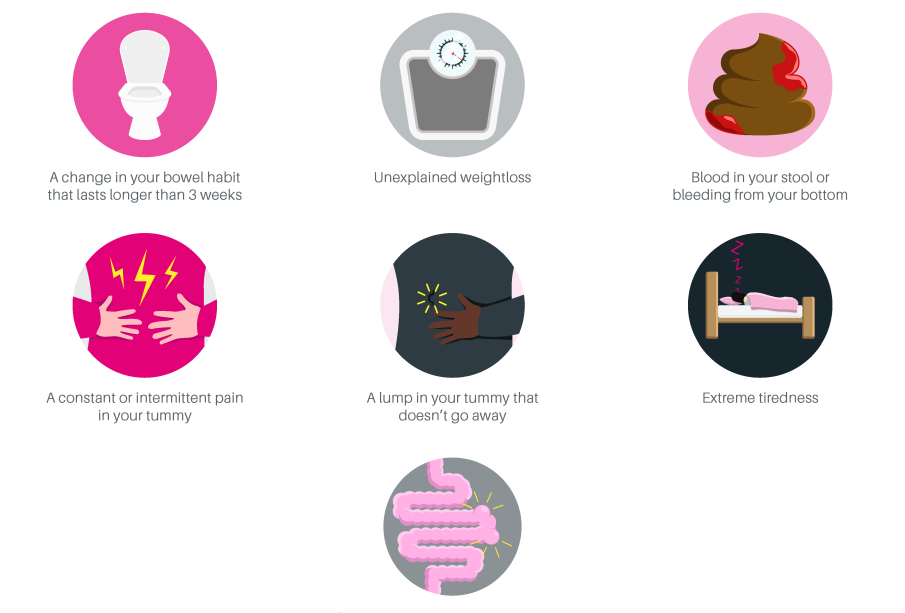 - Persistent change in bowel habits, such as diarrhoea, constipation or a change in stool consistency;